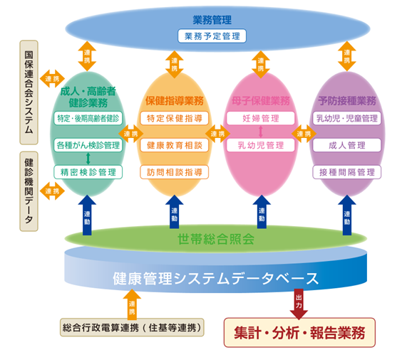 ■システムの特長 「自治体業務アプリケーションユニット」の準拠登録製品マークを取得した信頼性の高い製品です。 自治体様で行う地域保健サービスにおいて、保健師様、ご担当者様の業務を強力にサポートします。 ・ 成人健診・妊婦・乳幼児・予防接種・保健指導のデータを一元管理します。 ・ 妊婦届出から乳幼児健診までの一連の母子保健の経過が把握できます。 ・ 各種予防接種の予診票の印刷、接種間隔の管理など対応しています。 ・ 新たな予防接種の追加や接種間隔の変更が行えます。 ・ 成人・母子保健業務の保健指導(フォロー)対象者の把握が行えます。 ・ 成人・母子保健結果データから保健指導対象者の抽出が行えます。 ・ 世帯総合照会など世帯員の構成から、各人の過去の健診履歴や接種履歴、訪問相談記録、健康教室出席状況などが参照できます。 ・ EUC機能により、職員の方の操作、設定範囲が拡大、エクセルとの連携、帳票レイアウトの作成変更などが実現できます。 ・ 地域保健・健康増進事業報告書など集計根拠の確認が行えます。 ■システムの連携イメージ 新生児からお年寄りまで様々な保健事業に対して、各種情報をデータベースに一元化させ、また業務間連携・情報の連動より地域住民の健康管理を強力にサポートする総合健康管理システムです。 ■システムの主な機能紹介 セキュリティ、ユーザー・ログ管理 職員権限の細かな設定やデータ参照記録など、ユーザー・ログ管理の機能を強化しました。 システム管理者や一般ユーザーなど任意のグループ毎に、システムの使用できる範囲を設定することが出来ます。 また、データアクセスのログ管理が出来ます。 スケジュール、基幹システムとの連携結果表示 1) 直観的な操作で関連する内容へ画面遷移します。 ホーム画面から業務予定、訪問・指導の予定者の確認が出来ます。 訪問・指導予定者の予約状況の詳細画面へ遷移し、更に個人の成人健診、妊婦健診、乳幼児健診、予防接種等の履歴画面で詳細情報を確認する事が可能です。 2) 住民基本台帳、国保資格、課税非課税情報、後期高齢者資格、生活保護受給資格など基幹システムより連携した結果がホーム画面に表示されます。 世帯総合照会 世帯総合照会で世帯単位での訪問相談等、保健指導の充実が図れます。 ・ 世帯員の構成から、各人の過去の健診履歴や接種履歴、訪問相談記録、健康教室出席状況などが参照できます。健診の申込状況も確認できますので、訪問相談等の際、別の世帯員の受診勧奨も可能です。 ・ 個人から世帯へ、世帯から個人へ参照、母から子へ子から母へ母か ら兄弟児に等、様々な現場(電話受けながらなど)での閲覧要求を共通の操作性、画面構成にてご覧頂けます。 各種データ抽出 様々な項目のデータ抽出が可能です。 各種健診結果や未受診者、受診者、接種記録など様々な項目でデータ抽出が出来ます。 抽出条件(受診日等期間、年齢、論理演算子、検査結果等々の組み合わせ)は、パターン登録が出来、作成者単位、作成日範囲で条件パターン検索も可能です。 また、CSVやエクセル形式にて出力が出来ます。 成人健診 健診対象者抽出、健診申込登録、連合会データ連携、健診機関データ連携、無料クーポン券管理、結果登録、結果一覧、未受診者一覧、二次検診、精密検診、集計・統計などの様々な要求に対応しています。 妊婦健診、乳幼児健診 妊婦健診の結果入力など入力項目に変更ある場合も、マスタメンテナンス機能により追加・修正が出来ます。 また、入力の必須項目のチェック有無や入力表示順も変更が出来ます。 履歴参照、集計・統計等にも対応しております。 予防接種 予防接種対象者名簿の作成や各種予防接種の予診票印刷が出来ます。 予防接種台帳や予防接種済状況・接種証明書の発行が出来ます。 新たな予防接種の追加や接種間隔の変更なども可能です。 特定保健指導 特定保健指導機能により住基連携した業務管理が出来ます。 また、積極的支援、動機づけ支援、各種重症化予防対象など、特定健診結果などから抽出された住民の方への指導内容に応じて、各種ツールなど豊富な教材プリント(結果数値印字)を、住民の方単位で纏め印刷が出来ます。 保健指導管理 訪問指導・電話相談・健康教室等の実施状況の管理が出来ます。 登録した内容は地域保健・健康推進事業報告書等に出力が出来ます。 集計・報告書 地域保健・健康増進事業報告書など報告ものがシステムから出力可能です。 さらに、同報告書の人数の集計結果から根拠となる氏名等一覧が確認出来ます。 ■動作環境 【サーバ・OSなどの環境】 OS Windows Server 2008, 2012, 2016, 2019 データベース Oracle 11g 以上、等【クライアントOSなどの環境】 OS Windows7(32bit,64bit)以上 ブラウザ Chrome, Firefox, Internet Explorer11以上, Microsoft Edge, Opera【お客様のご要望に応じて、オンプレミス環境、クラウド環境、LGWAN環境でのシステム提供が可能です。 ■画面イメージ メイン画面登録